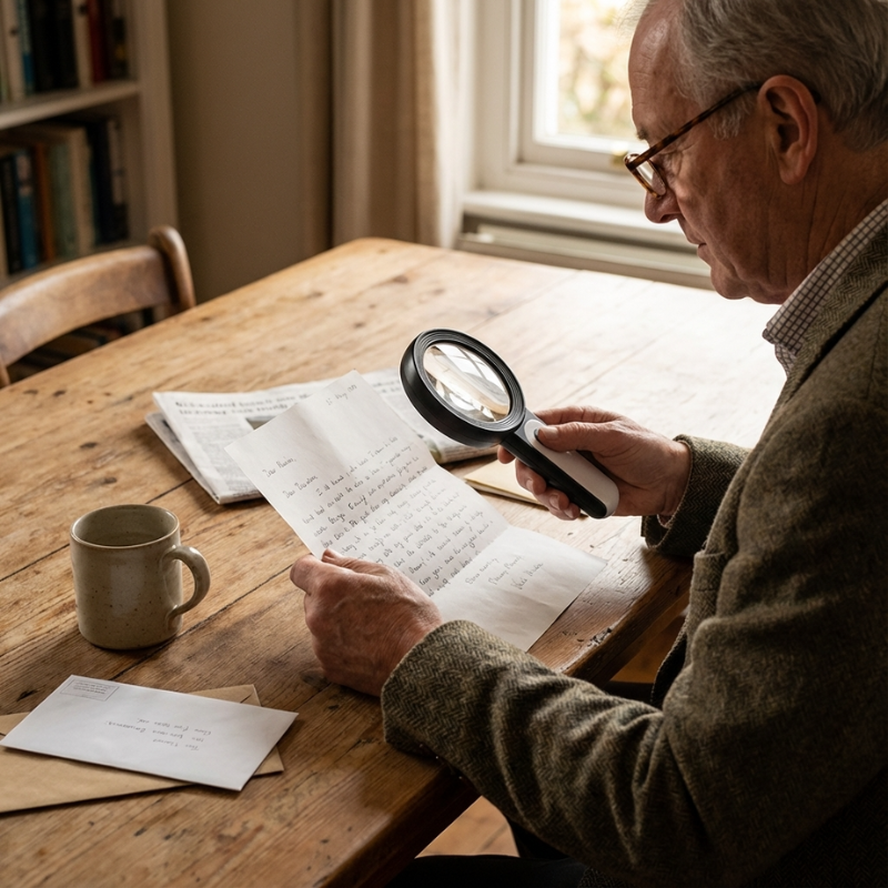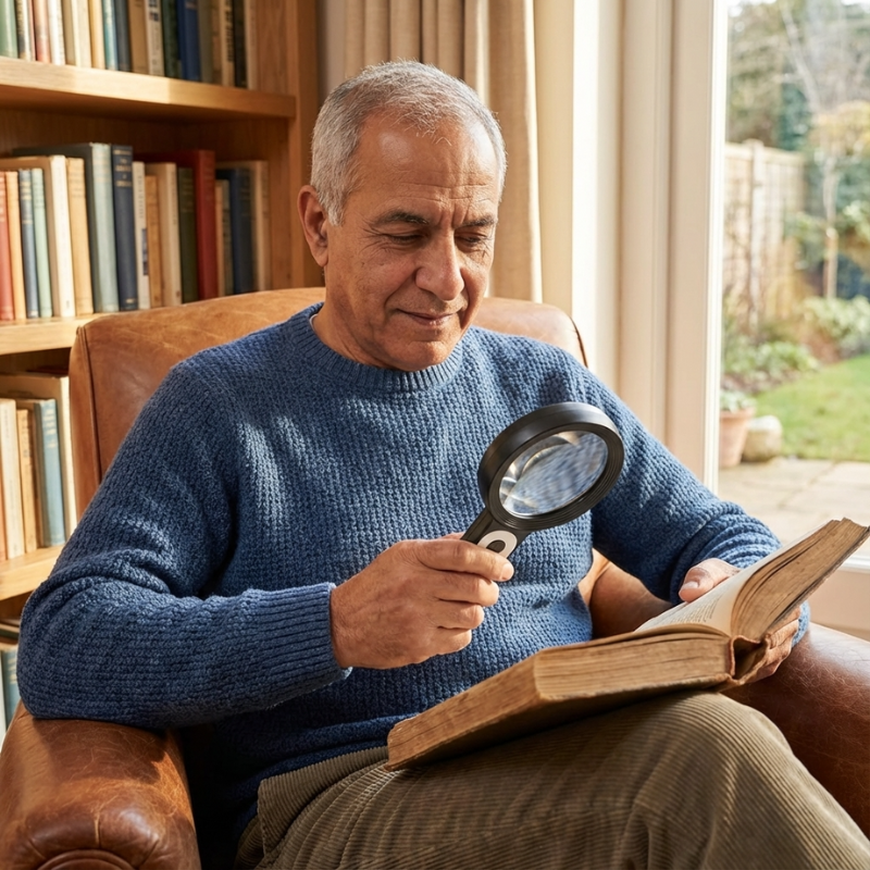 The Angel 4x Ultra HD Magnifier combines sharpness, clear magnification, and reliability for the most precise viewing experience. It's ideal for patients with slightly lower visual acuity of about 6/10 or worse. Generally this is anyone with moderate macula degeneration or moderate to severe glaucoma. Designed to address common frustrations with standard magnifiers, this magnifying glass features 18 bright LED lights that offer day, night, and glare-reduction modes, ensuring perfect visibility in any lighting condition.