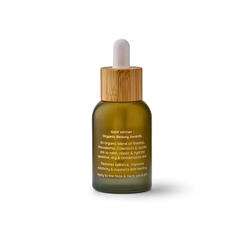 Made from certified organic, cold-pressed plant oils, this face oil helps reduce inflammation, soften fine lines, and restore balance to skin that feels fragile or easily irritated. Rosehip, macadamia, calendula and jojoba work together to support elasticity, strengthen the barrier, and calm redness - all while absorbing quickly with no greasy finish.