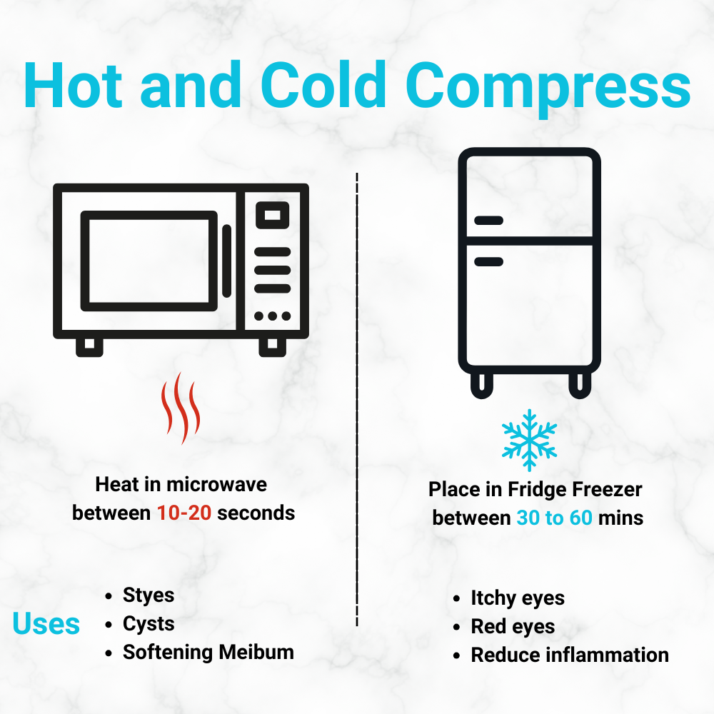 For warm therapy, submerge the mask in hot water (around 40–45 °C) for 3–5 minutes or microwave in short 10-second intervals, checking the temperature for comfort before applying for 7–10 minutes to ease dry eye symptoms and unlock meibomian glands.